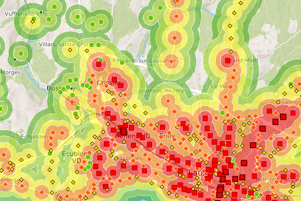La couche de point contient la localisation des arrêts de transport public vaudois et l’offre (fréquence) par type de transport public. Il y figure également les résultats du calcul de la catégorie et de la classe d’arrêt.
