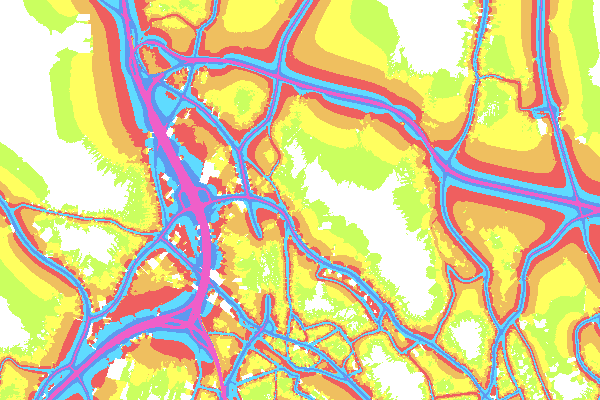 Le cadastre de bruit est déterminé sur la base d'une modélisation informatique prenant en compte les sources de bruit (axes routiers avec leur trafic et leurs pentes) et les obstacles formés par les bâtiments.