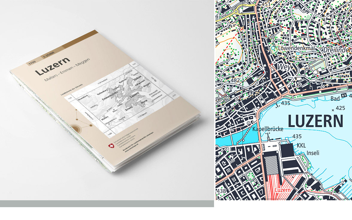 The National Map 1:25,000 is a topographic map of Switzerland representing the areas of traffic and settlements, the hydrography, the topography and the vegetation in great detail. The update is done by sector. The current status of the map is displayed by default in the federal map viewer. With the ‘journey through time’ function, all available data statuses since 1952 can be displayed. The detailed statuses of updates are shown in the layer "<a href=" https://map.geo.admin.ch/?lang=en&topic=ech&bgLayer=ch.swisstopo.pixelkarte-farbe&layers=ch.swisstopo.pixelkarte-pk25.metadata" target="_blank">Division national map 25 Raster</a>". The current National Map 1:25,000 is published in analogue format as a printed map and in digital format as the Swiss Map Raster or Swiss Map Vector.
