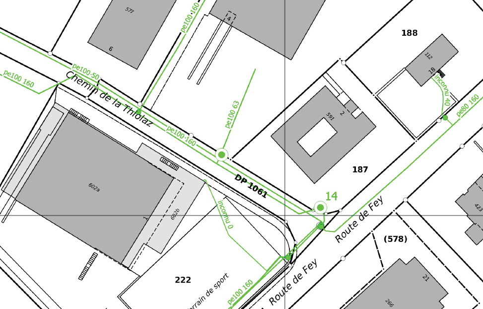 Avant tous travaux, sur ou à proximité du réseau d'eau potable, la position et la profondeur exactes des conduites doivent être déterminées par sondage(s). En outre, toutes les canalisations souterraines en service ne figurent pas sur ces plans. Consulter également les plans des réseaux de tous les services intéressés.