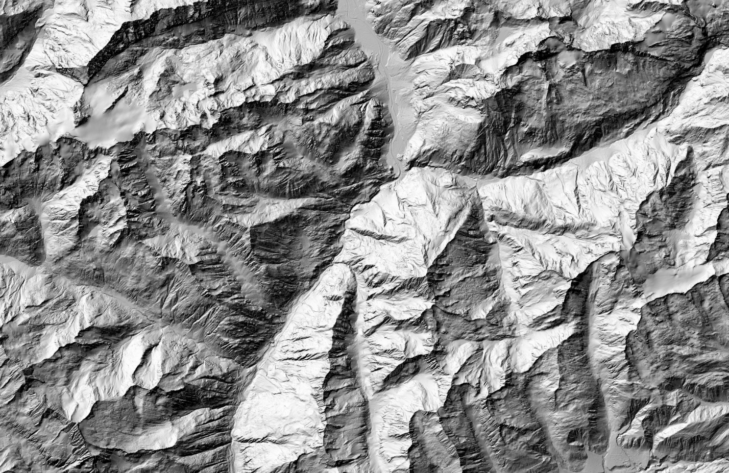The hillshade is derived from the digital elevation model swissALTI3D. It illustrates the surface relief of Switzerland and the Principality of Liechtenstein. A hillshade is derived from the elevation model by calculating the exposure of the surface to sunlight at a certain or several angles. The monodirectional swissALTI3D hillshade is generated using a northwestern sun position as light source.