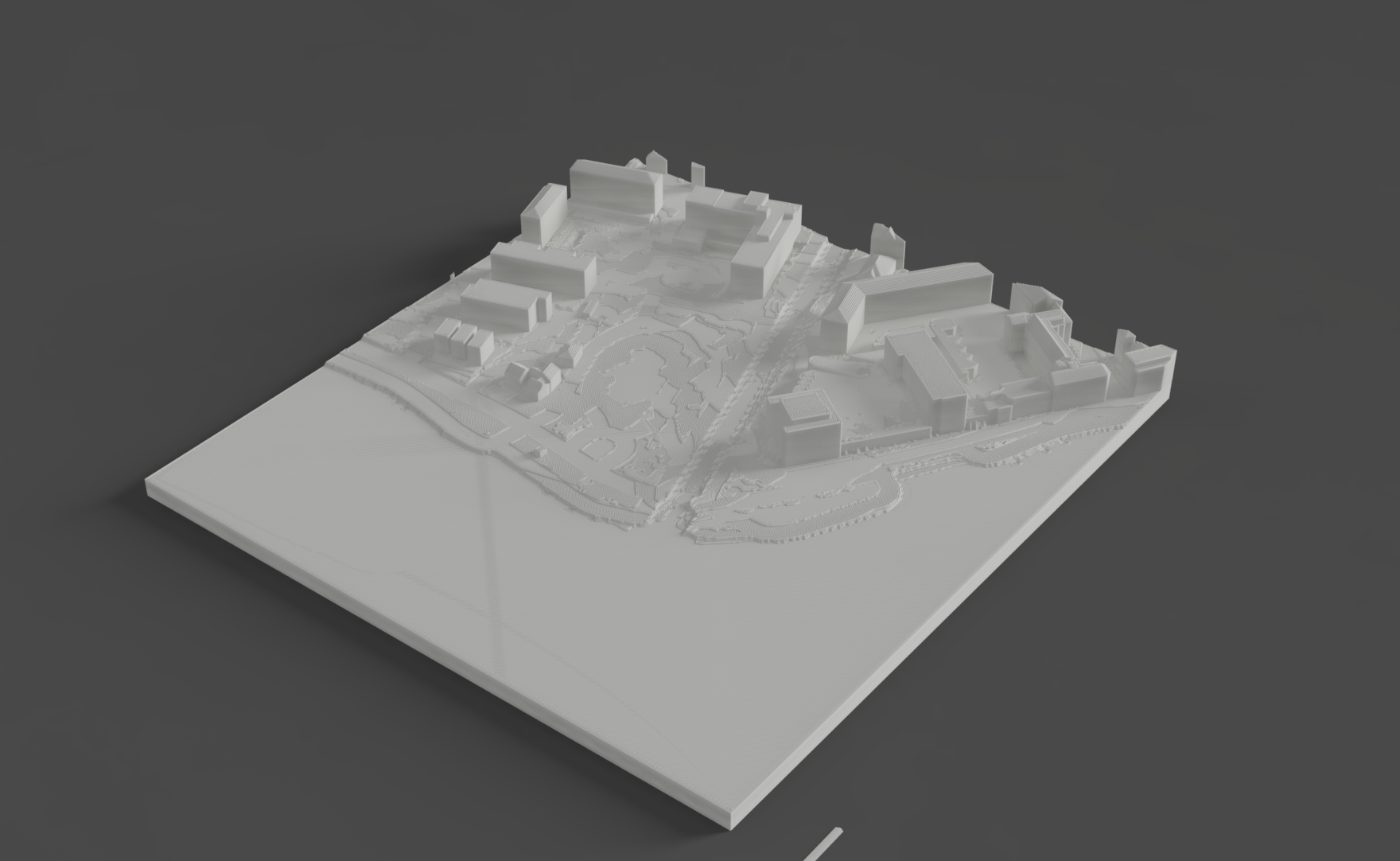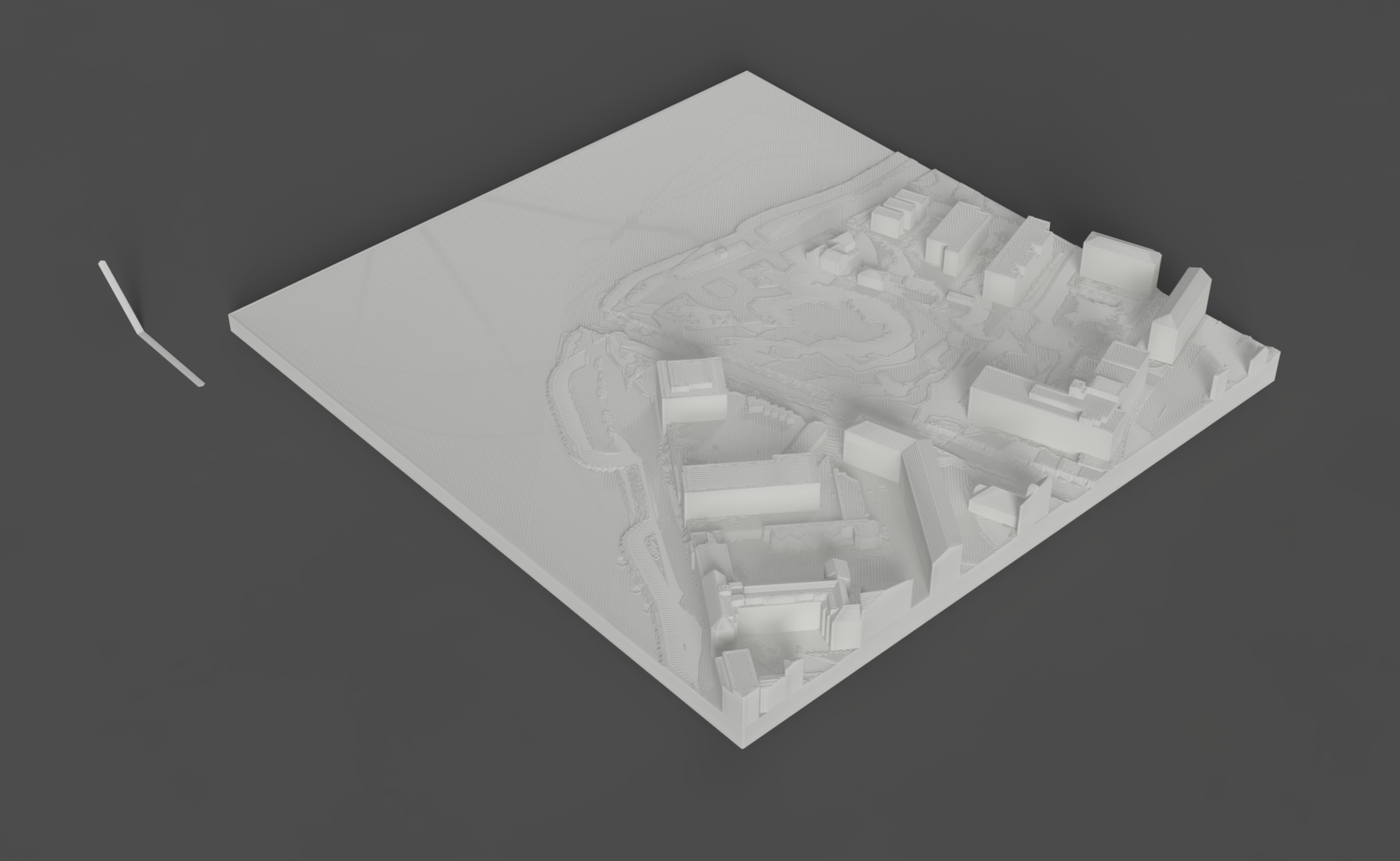- Le terrain à 2m de résolution, découpé selon les routes, qui sont utilisées comme lignes de rupture. Le terrain est extrudé de -10m depuis l'altitude minimale de l'étendue extraite. Il est ensuite fermé par une base plate.