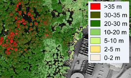 Le MNC ou modèle numérique de hauteur de la végétation a été généré par la différence entre le modèle numérique de surface (MNS) et le modèle numérique de terrain (MNT), en utilisant uniquement les zones classées en "végétation haute" du nuage de points LIDAR.
