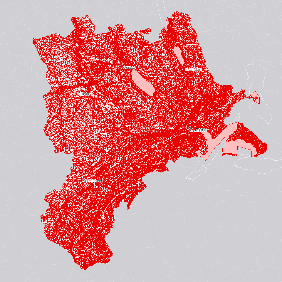 Die Oberflächenabflusskarte entspricht einer Gefahrenhinweiskarte und wurde mit Hilfe des digitalen Terrainmodells, eines Niederschlagsszenario (Gewitter mit Wiederkehrperiode von 100 Jahren) und der Bodenbedeckung der amtlichen Vermessung modelliert. Die Befunde der Oberflächenabflusskarte sind somit vor Ort zu plausibilisieren.