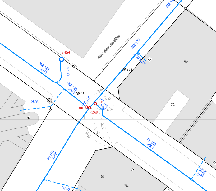 Plan de réseau de distribution et d'adduction d'eau potable du SIGE (Service Intercommunal de Gestion). Le plan contient les conduites avec indication de diamètre et de matériau, les vannes et les hydrantes avec leurs numéros le cas échéant. Selon le secteur concerné, il peut également s'agir de conduites de transport traversant certains communes pour lesquelles une autre organisation assure la distribution d'eau potable.