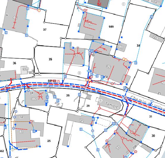 Sont figurées les canalisations, regards de visites et autres objets des réseaux communaux et privés connus