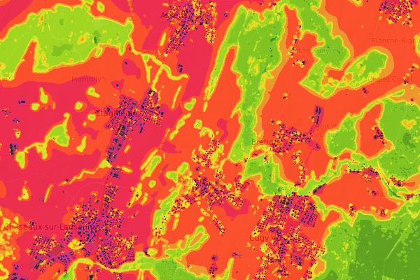 Attention, les cartes climatiques sont issues d’une modélisation complexe. Même si les résultats sont représentatifs de la réalité (validation effectuée avec des mesures de terrain), ces cartes doivent être lues dans leur globalité. De plus, la résolution horizontale du modèle (10m x 10m) exige de s’en tenir à une lecture à l’échelle d’un quartier ou d’un village (i.e. le pixel ne doit pas être interprété isolément pour la valeur qui lui est attribuée dans ce cadre).