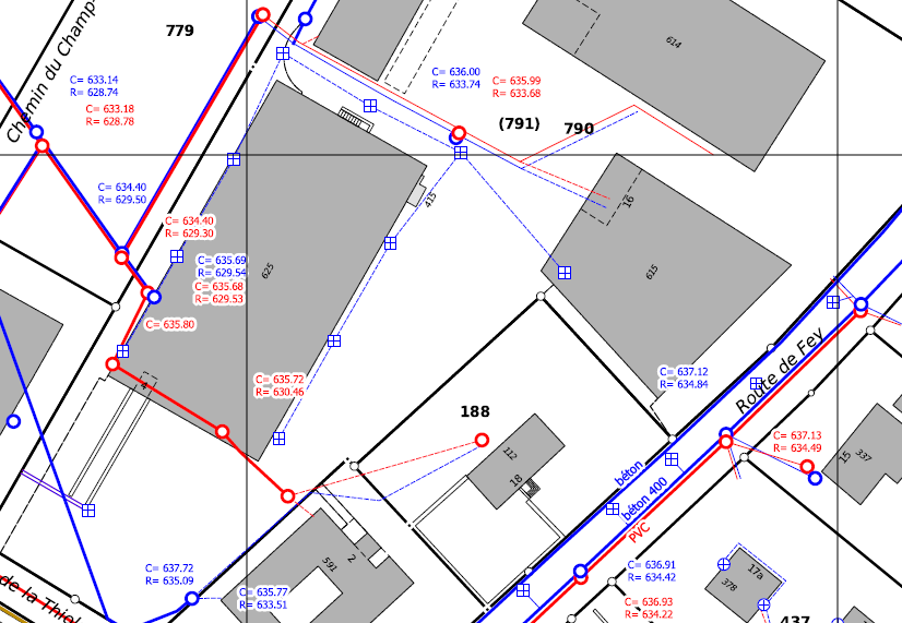 Plan des canalisations d'eaux claires et d'eaux usées. Sont figurés les canalisations, regards de visites et autres objets des réseaux communaux et privés recensés.