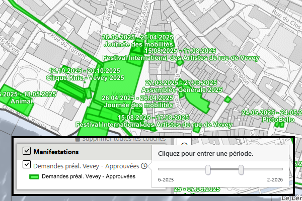 Contient les demandes préalables de manifestations de Vevey ayant lieu sur le domaine public, et ayant été approuvées par la Municipalité.