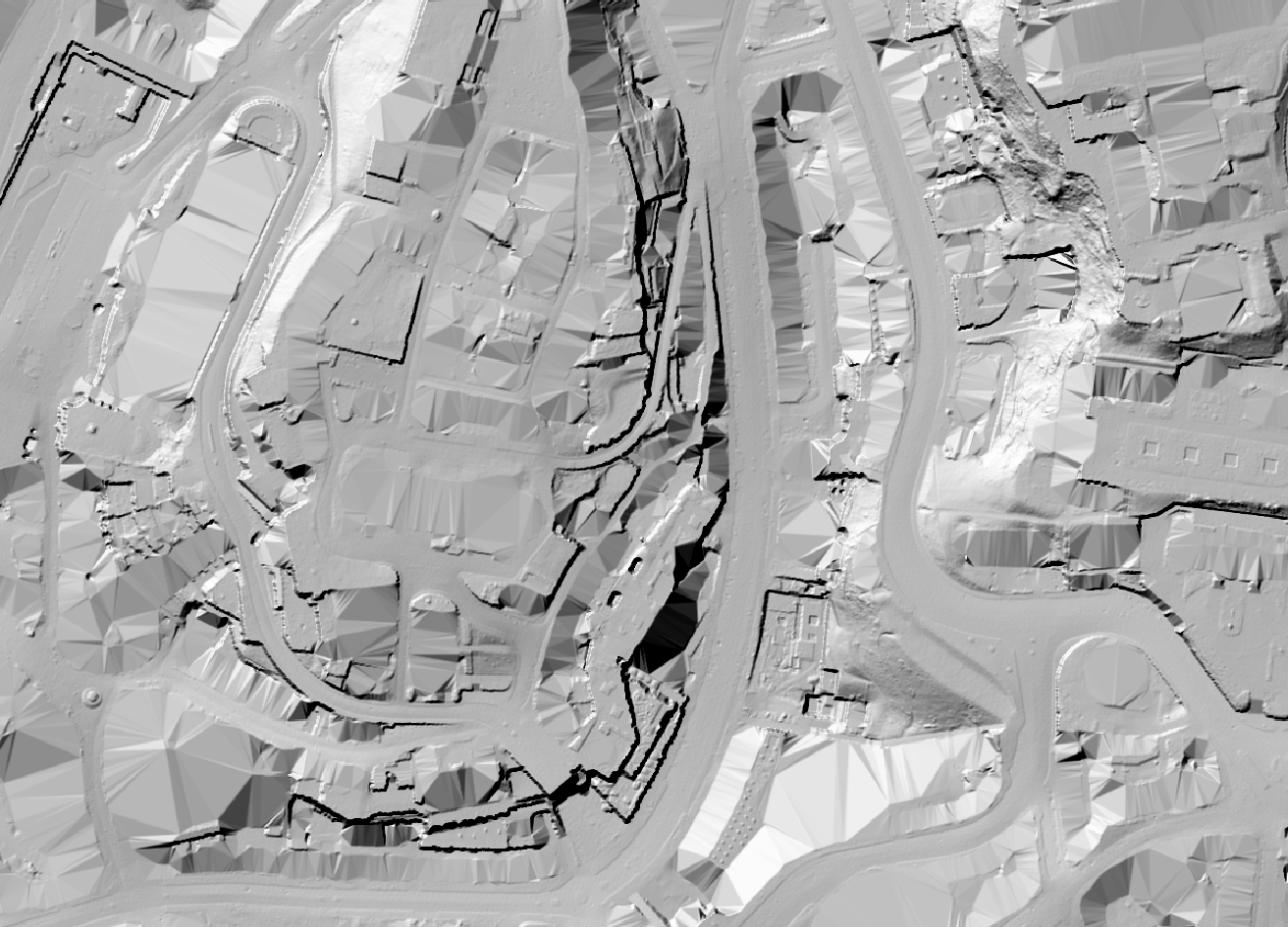 Ces ombrages ont été réalisés par la méthode standard : illumination virtuelle d’un azimut de 315° et une élévation de 45° sont appliquées. La grille est à 0.5m de résolution.