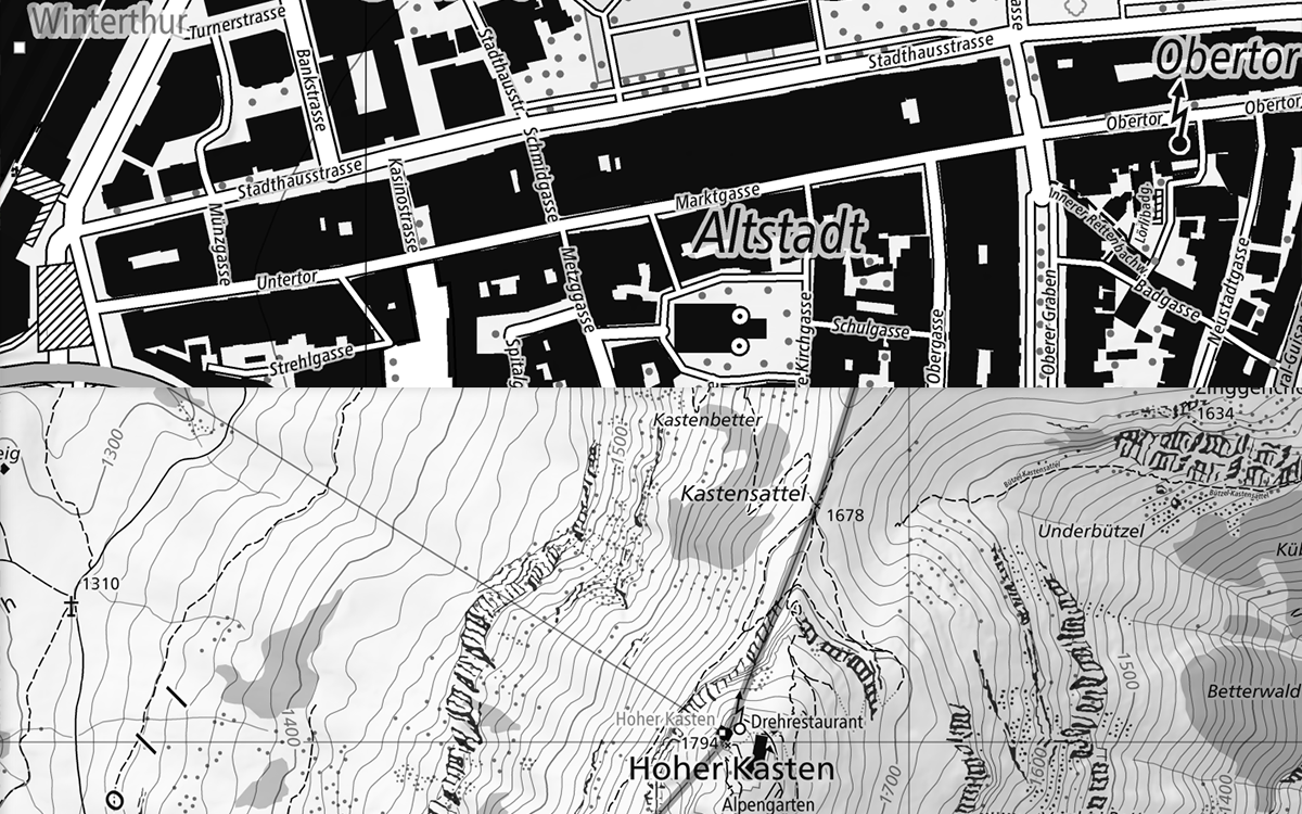 The 1:10,000 national map is swisstopo’s largest scale topographic map. It stands out for its detailed representation of traffic, settlements, terrain and vegetation as well as its thorough labelling. The contents are supplemented by rock hachures and relief. The perimeter of the map covers the national territory of both Switzerland and the Principality of Liechtenstein. Updates are made every year based on the latest version of swisstopo’s topographic landscape model (TLM). The 1:10,000 national map is produced in digital form in colour and greyscale. Both of these versions of the map form the basis for Switzerland’s geo data viewer (map.geo.admin.ch) in the first four zoom levels. The 1:10,000 map is also available as “Swiss Map Raster 10” in the form of geo-referenced TIF data and as "Swiss Map Vector 10" for individual sections of the perimeter.