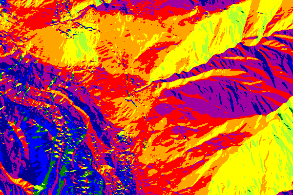 - Orientation du MNT exprimant l’orientation de la pente entre 0° (Nord) et 360° dans la direction horaire et à 0.5m de résolution