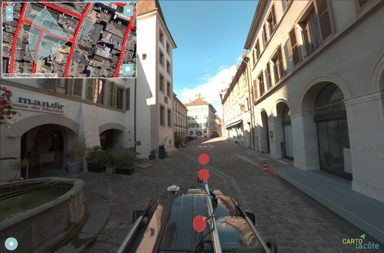 Photographies panoramiques des routes, pistes cyclables et zones piétonnes de la Ville de Nyon. L'acquisition a été réalisée en octobre 2024 par un véhicule et un dispositif piéton.