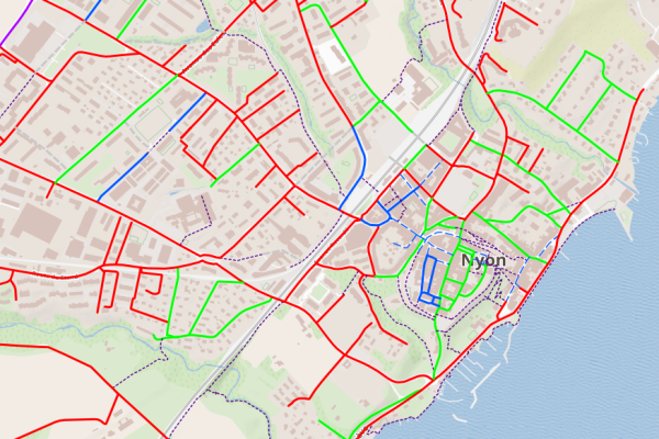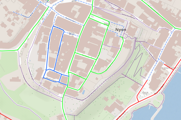 Cette couche se réfère aux différentes voies de circulation de la Ville de Nyon. Elle permet de visualiser les limitations de vitesse actuelles et planifiées sur les axes routiers de la commune. La couche présente également les différentes zones et liaisons piétonnes.